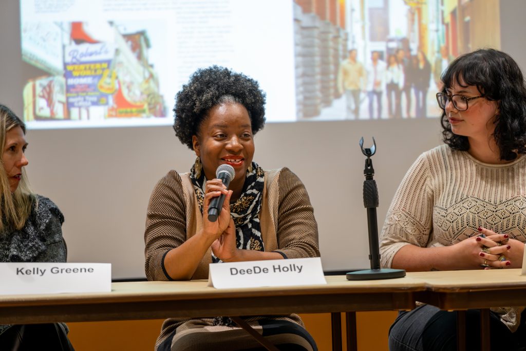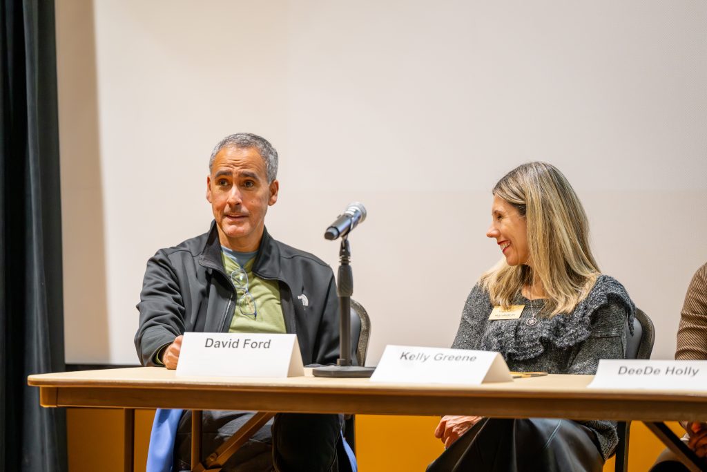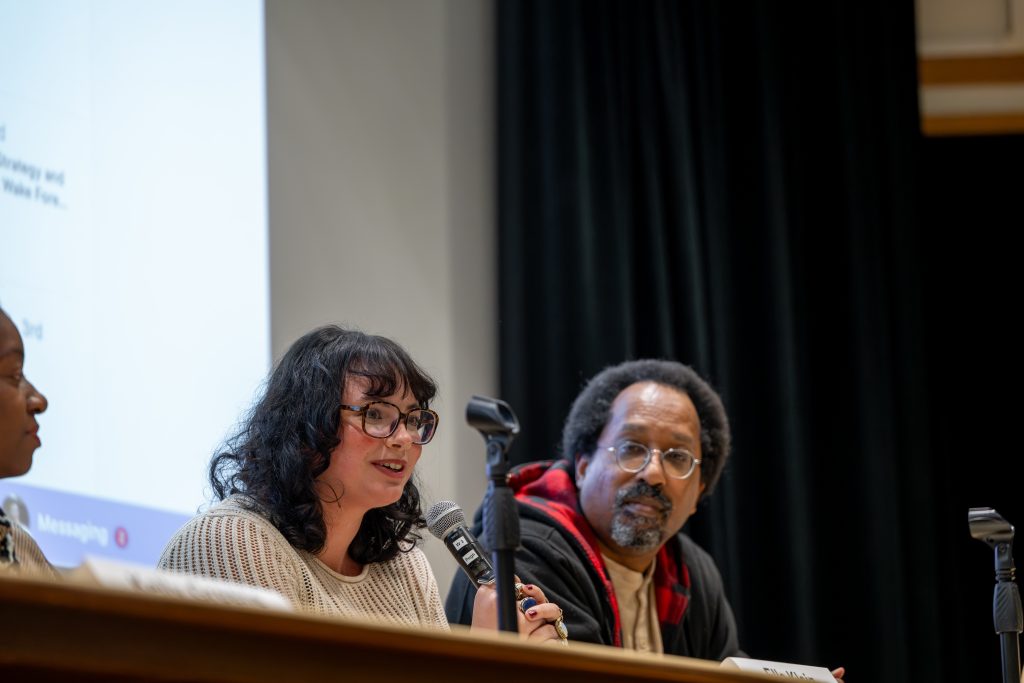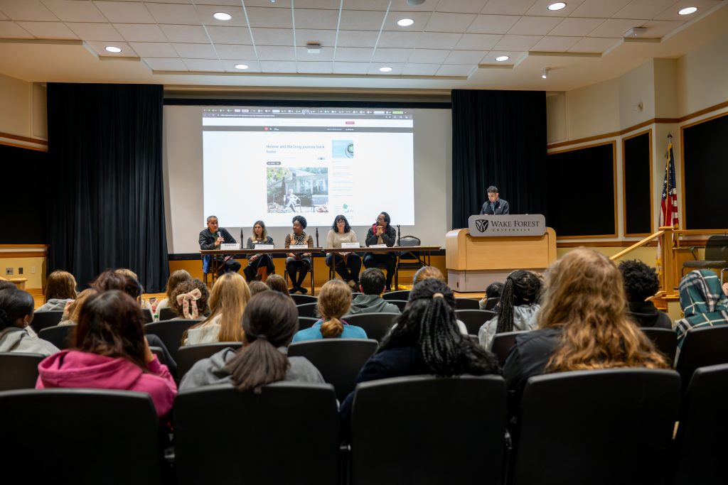 The visit concluded with a panel discussion featuring Wake Forest communicators DeeDe Pinckney Holly, director of internal communications; Kelly Greene, managing editor of Wake Forest Magazine; and David Ford, WFDD general assignment reporter. They were joined by local journalist Michael Hewlett of The Assembly and Ella Klein, Wake Forest senior and editor-in-chief of the Old Gold & Black.