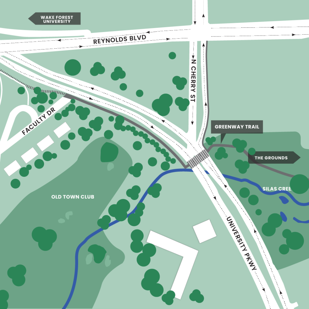 Construction on a new pedestrian pathway connecting Faculty Drive to The Grounds will begin in early March. In partnership with the North Carolina Department of Transportation, the development and construction teams behind The Grounds will re-engineer the intersection at University Parkway and North Cherry Street. The goal is to simplify a complex roadway and slow traffic, creating a safer, pedestrian-friendly connection.