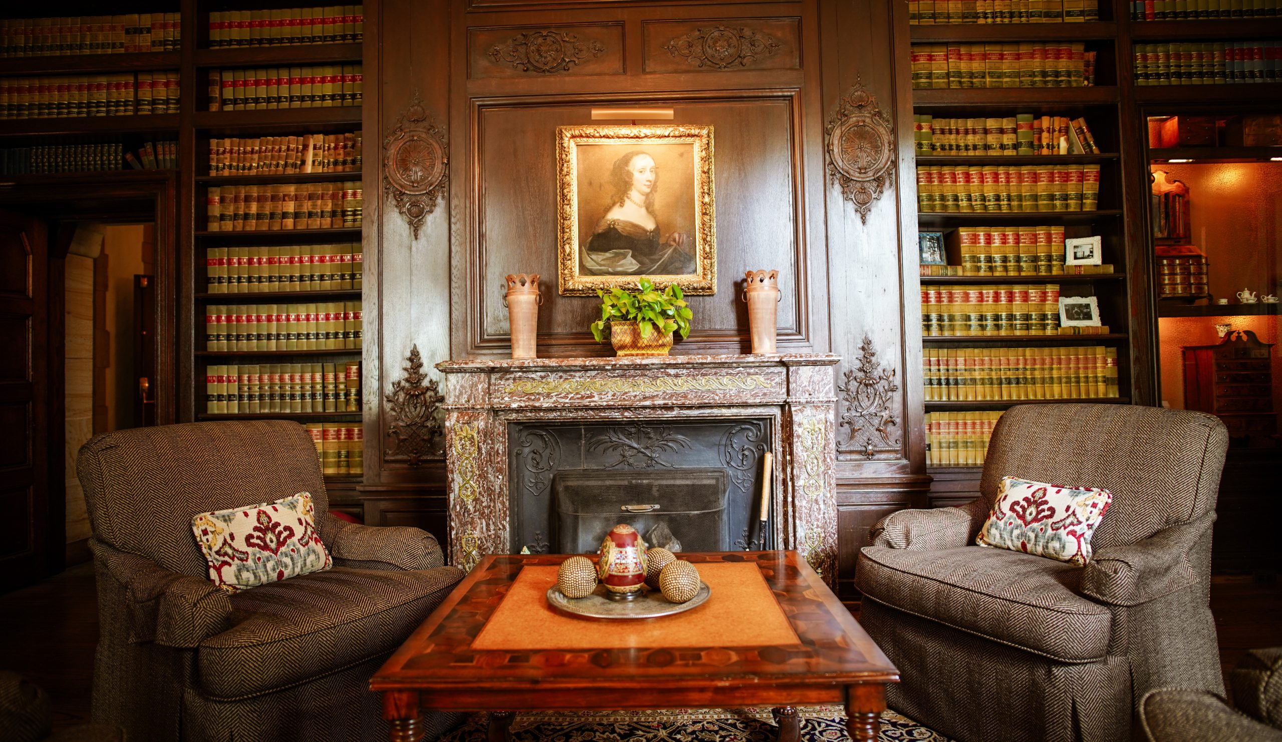 The Manor House shows off exquisite Norman Revival-style architecture outside, and inside you’ll find equally exceptional features. Carrie DuPre, Marketing Manager, shared “The Graylyn estate is a living gallery showcasing global craftsmanship, blending gems dating back to the 17th century with handcrafted elements from the 1920s and 1930s. Our estate’s unique character is highlighted by its original ironwork, which adorns the Manor House, the balcony of the Atlantis Room, and the grand stair tower. In the Persian Card Room, you will find Syrian walls that date back to the 17th and 18th centuries, hand-selected by the Gray family on a trip to Istanbul in 1928. Our Library features walls imported directly from Paris in the 1920s and an ornate wood-burning fireplace.”