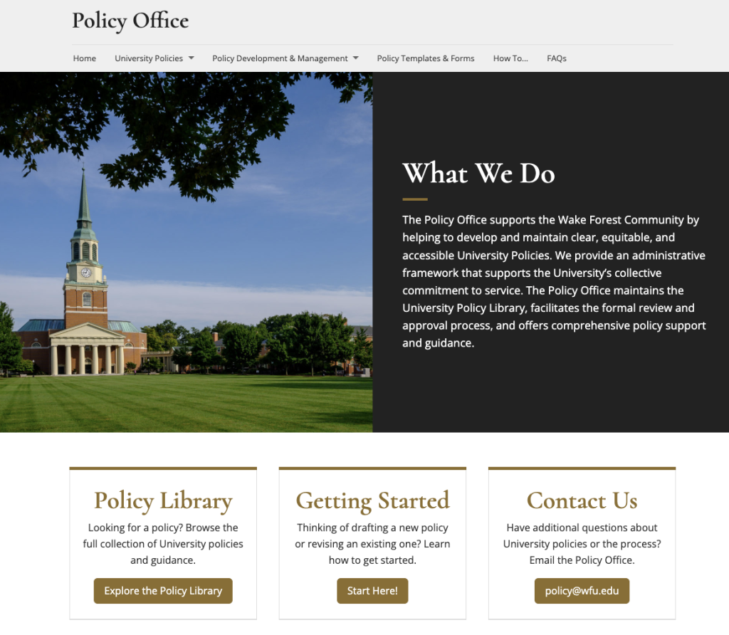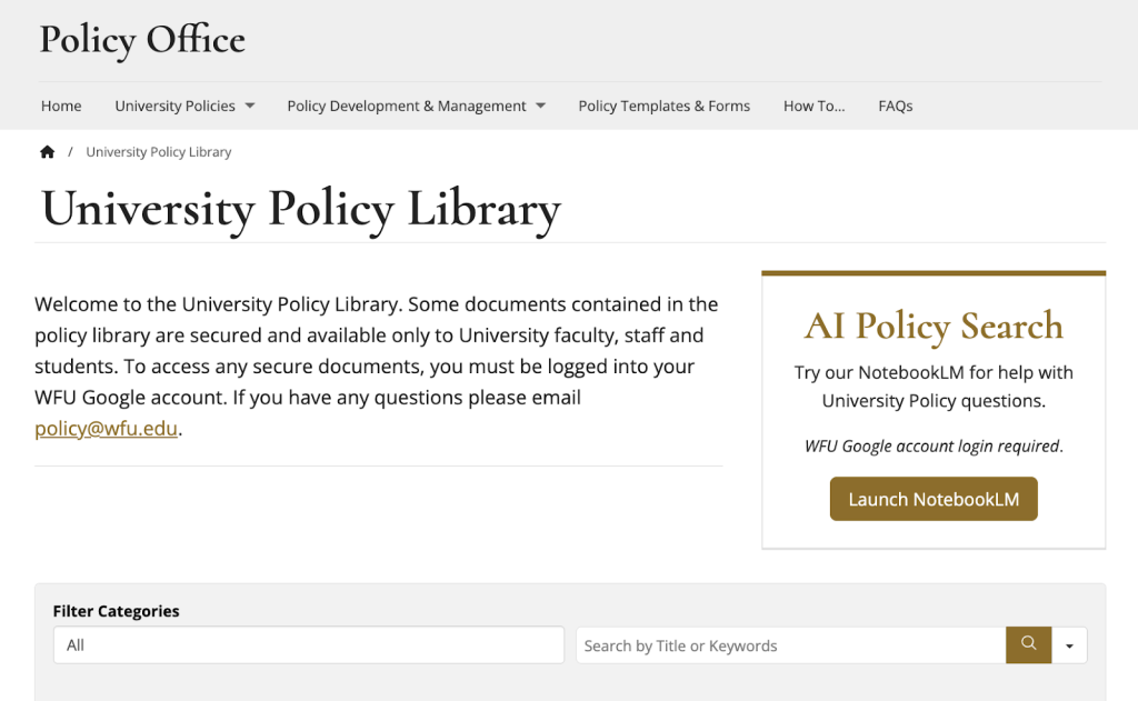 Accompanying the launch is an enhanced website at policy.wfu.edu, offering resources like policy templates, guidance on the policy process, and frequently asked questions. The site also features an enhanced University Policy Library with advanced search capabilities, including category filters and keyword search. Most notably, the site includes an AI-Powered policy search tool utilizing NotebookLM to provide quick, accurate answers to your University Policy questions.